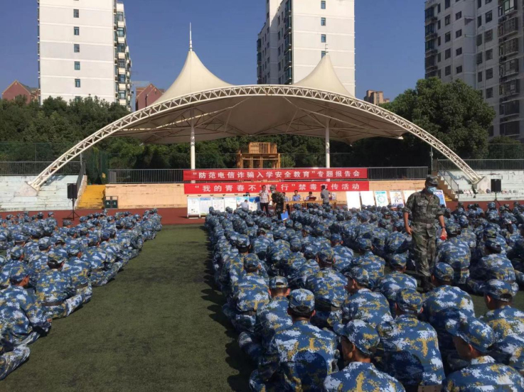 本网讯 2021年9月18日,保卫处联合包河公安分局和包河区反诈中心,在北校区组织2021级新生进行防范诈骗安全知识报告会和我的青春不“毒”行的禁毒宣传活动。