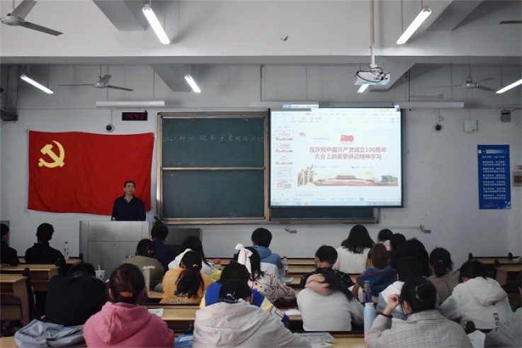 本网讯,百年征程波澜壮阔,百年初心历久弥坚。为进一步激励同学们从百年党史中汲取奋进力量,11月10日,材化学院在逸夫楼举办了专题党课,由学院党委书记万德军对习近平总书记“七一”重要讲话进行解读、宣讲。