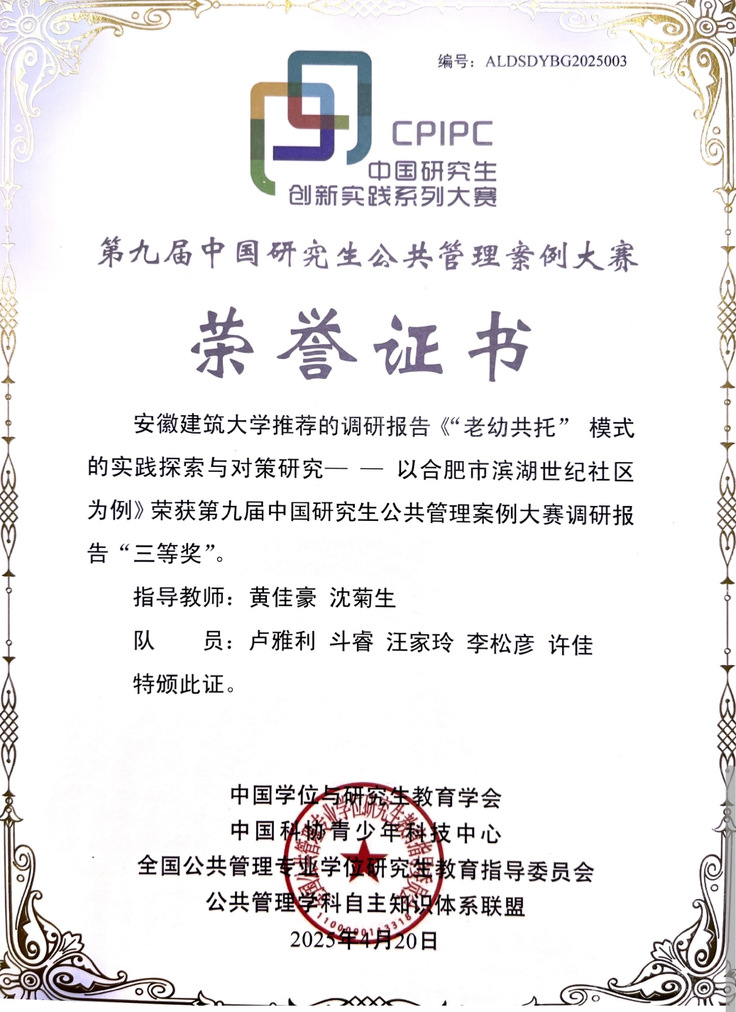 本网讯 近日,第九届中国研究生公共管理案例大赛证书发放,由公共管理学院黄佳豪、沈菊生老师指导,研究生卢雅利、斗睿、汪家玲、李松彦、许佳小组撰写的调研报告《“老幼共托”模式的实践探索与对策研究一一以合肥市滨湖世纪社区为例》荣获第九届中国研究生公共管理案例大赛调研报告“三等奖”。