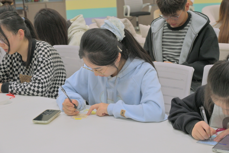 活动围绕“诵、创、享”层层展开:优秀作品朗诵环节率先进行,学子们声情并茂地诵读秋日主题佳作,抑扬顿挫间传递文字里的秋意与情思,现场不时响起共鸣的掌声;书签制作现场,大家专注地剪裁、勾勒,将秋日景致与阅读感悟凝结于方寸之间,指尖流转间完成专属阅读纪念;作品创作交流环节中,参会者踊跃分享图文、诗歌、文章的创作思路以及学习生活经验,思想碰撞中不时迸发出新的灵感火花。