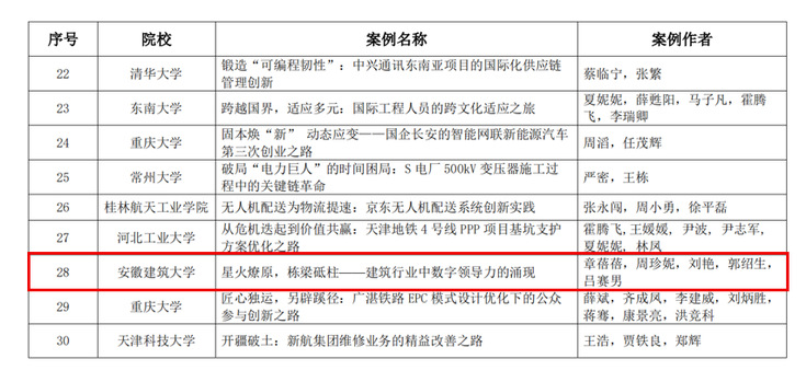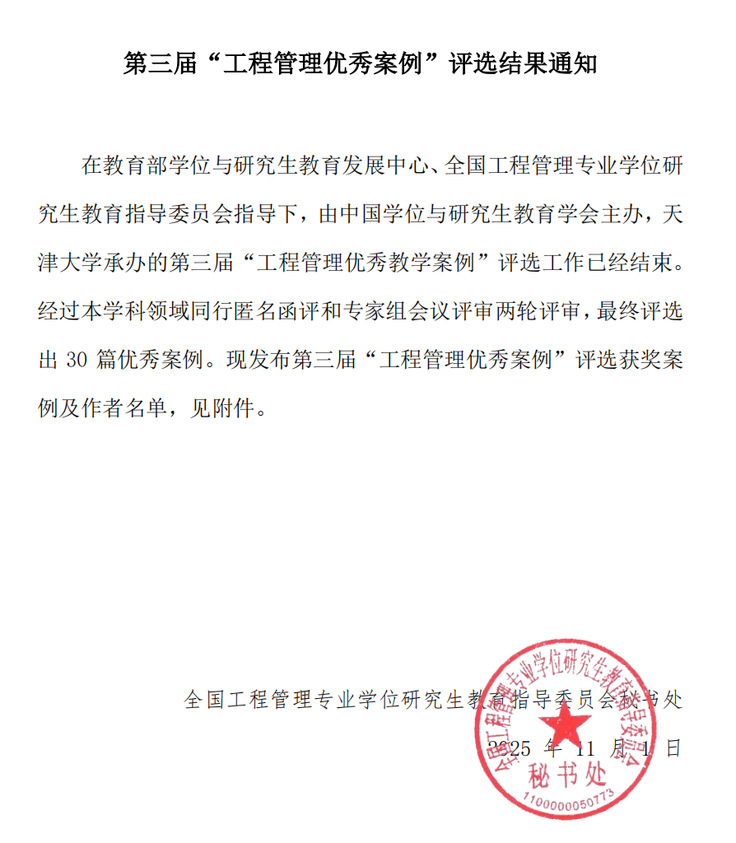 评选过程遵循公开、公平、公正的原则,经过各高校推荐、同行专家匿名函评及会议评审,最终评选出30篇优秀案例。经管学院章蓓蓓教授团队编写的案例《星火燎原,栋梁砥柱——建筑行业中数字领导力的涌现》获评优秀教学案例,这也是该团队继2024年荣获第二届工程管理优秀案例后再次获奖。