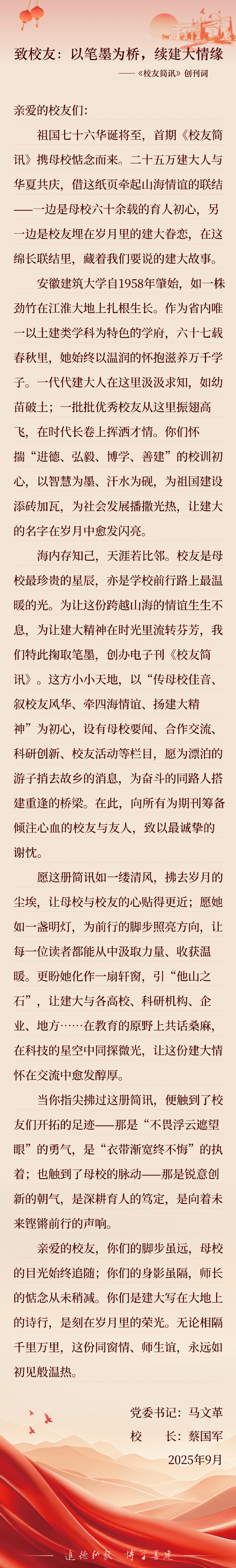 本网讯 金秋送爽,家国同庆。在中华人民共和国成立76周年的喜庆时刻,beat365亚洲体育官方网站校友简讯电子版如约而至。校党委书记马文革,校党委副书记、校长蔡国军携全体师生,谨以这纸承载思念与荣光的简讯,向海内外每一位建大校友致以最诚挚的节日祝福与深切问候。