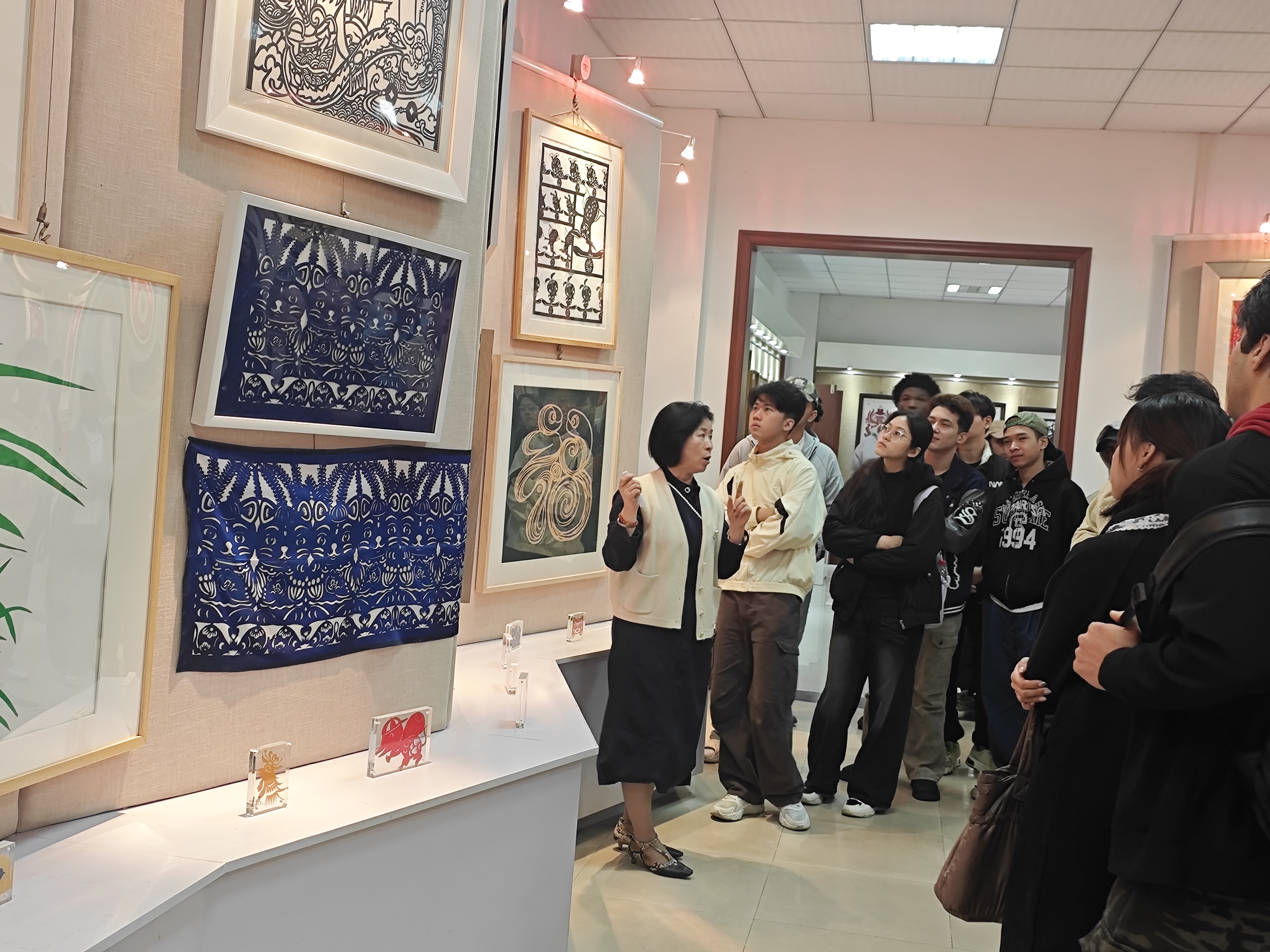 活动伊始,三联学院周鸣老师带领国际学生参观剪纸艺术展厅,展厅内,一幅幅题材鲜活、技法精湛的剪纸作品错落陈列,周老师以作品为媒,从剪纸的历史渊源切入,讲解了剪纸在中国婚庆、节庆等场景的吉祥寓意,还展示传统花鸟纹样与现代元素结合的作品,让国际学生直观了解剪纸艺术的生命力。