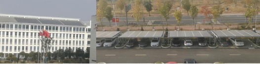 巢湖属北亚热带温润性季风气候,大气环流以西风环流及亚热带环流为主,该流域年平均气温在15-16℃之间,四季分明,年降水量约1000毫米。合理利用校园地势特征,一个生态湖和一条小溪贯穿校园,生机勃勃。周边无高层建筑,日照充足,空气质量高,建筑屋顶、停车棚顶大面积敷设太阳能光伏板(如图1),并网发电,敷设面积约1万平方米,装机容量1.3MW,年发电量170万度,用于师生的学习生活,结余电量并入国家电网,有效利用太阳能。校区内设有电动车智能充电桩,校门左右侧均有固定公交站以及共享电动汽车,现代化智能化人性化,交通便利。