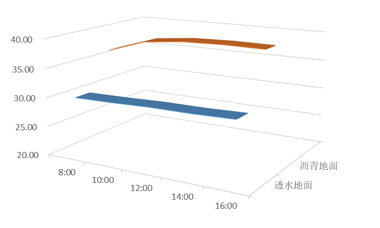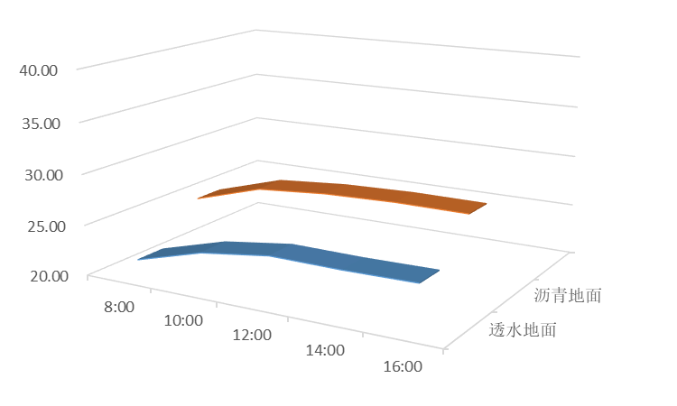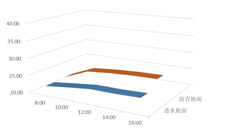 重点实验室室外地面面积32641.3㎡。其中室外透水地面实土绿化22132.7㎡,停车位镂空铺地面积1380.5㎡,透水铺装总面积23513.2㎡。透水地面的主要作用就是大量收集雨水,减小城市排水压力,有效补充地下水,而且可以吸收地面扬尘,夏天比常规路面更凉爽,缓解城市热导效应。本次研究主要针对透水地面的降温效果,于夏季将温度计置于透水地面及附近的校园主路硬化地面(沥青混凝土铺面道路),从2019年6月开始,每次降雨后读数一次,连续读数4个月,用数据对比热导效应降低效果。