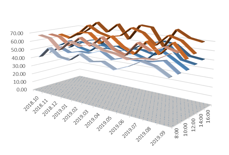 说明:图1至图4下方三维带状折线代表室内分贝值,上方三维带状折线代表室外分贝值。