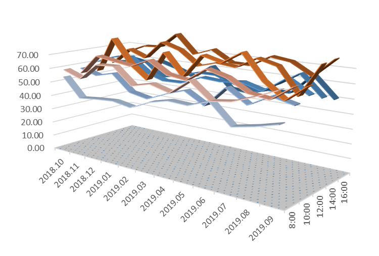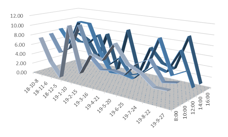 说明:图5至图12三维带状折线代表风速值,单位为公里/小时;在所选的日期内,淮南市所有天气预报的风速值均为1-2级,对应的风速值应小于11公里/小时。