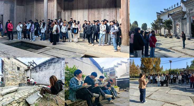 全体师生实地调研了屏山村的水系格局与古桥体系、南屏村保存完好的宗祠建筑与“迷宫式”巷道肌理、宏村“牛形村落”独特布局、塔川秋色与田园景观,让学生近距离感受到了徽州建筑的匠心精神与地域文化美学。通过现场观察、绘图记录与摄影采风,学生们对徽州建筑空间、材质、装饰技艺及其所承载的文化意义有了更直观地体悟。