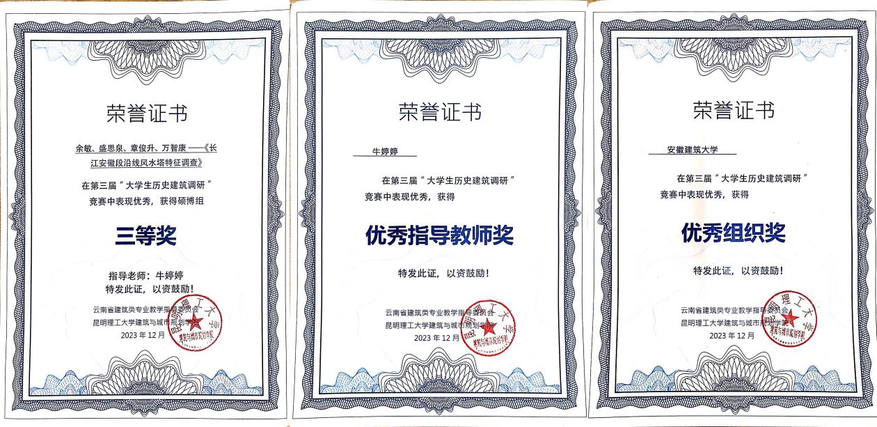 本网讯 近日,在由云南省建筑类专业教学指导委员会和昆明理工大学建筑与城市规划学院主办的“第三届大学生历史建筑调研”竞赛中,建规学院建筑学研究生余敏、盛思泉、章俊升、万智康提交的《长江安徽段风水塔特征调查》荣获硕博组三等奖。牛婷婷副教授获优秀指导教师奖,beat365亚洲体育官方网站获优秀单位组织奖。
