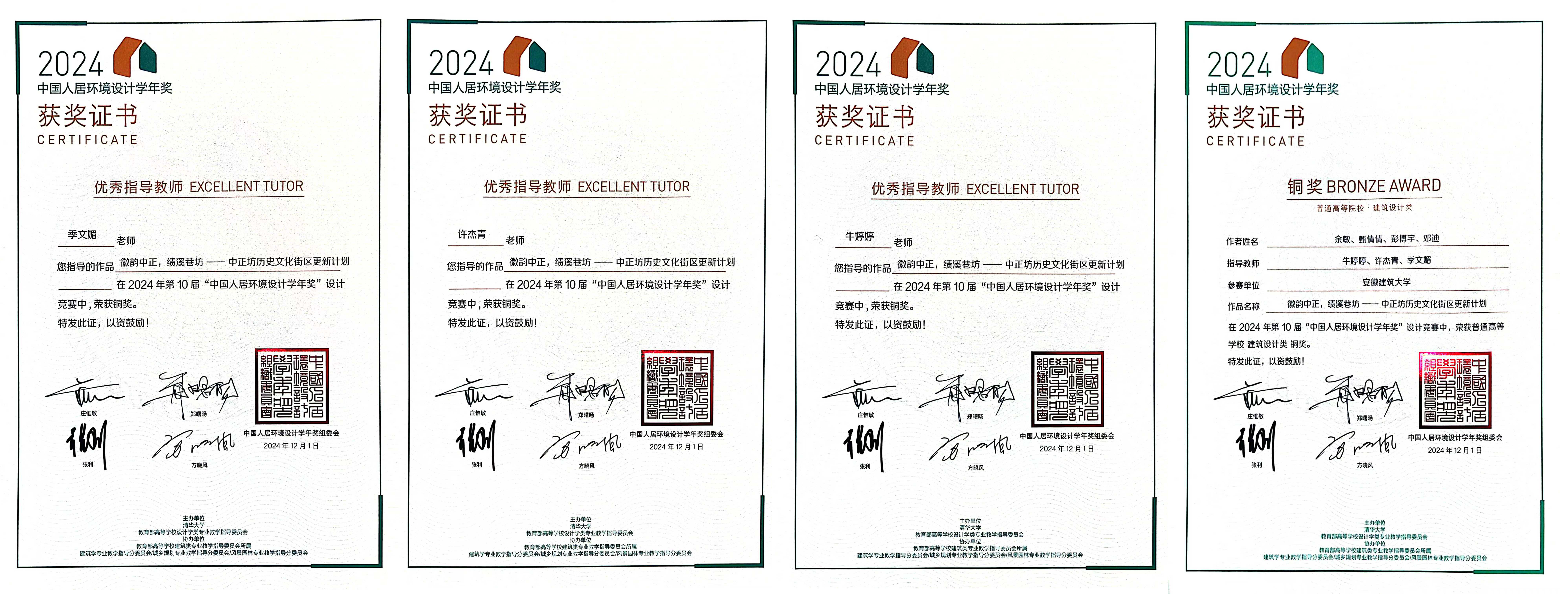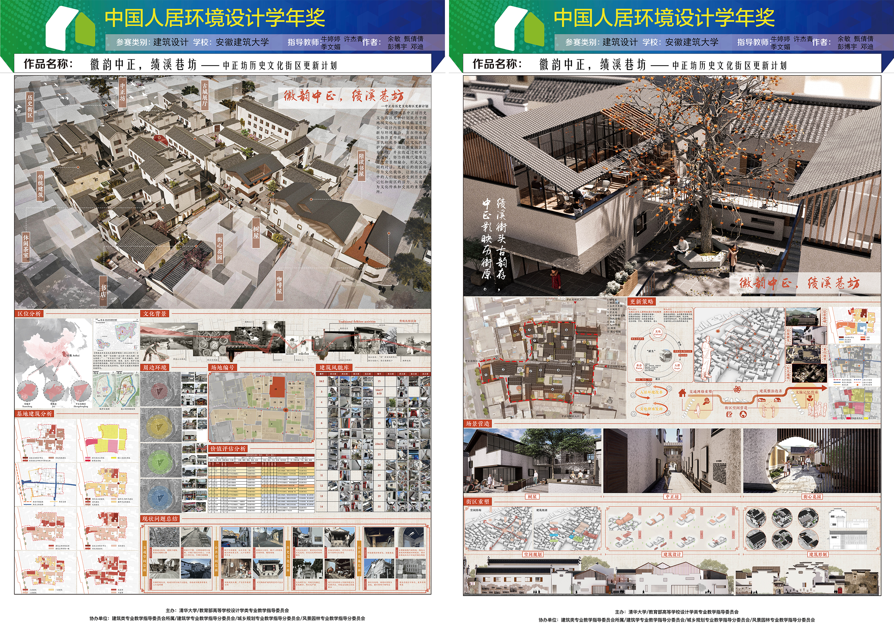 本网讯 近日,由清华大学与教育部高等学校设计学类专业教学指导委员会主办的“第十届中国人居环境设计学年奖”竞赛中,beat365亚洲体育官方网站研究生余敏、甄倩倩、彭博宇、邓迪凭借作品《徽韵中正,绩溪巷坊——中正坊历史文化街区更新计划》荣获建筑设计组铜奖。
