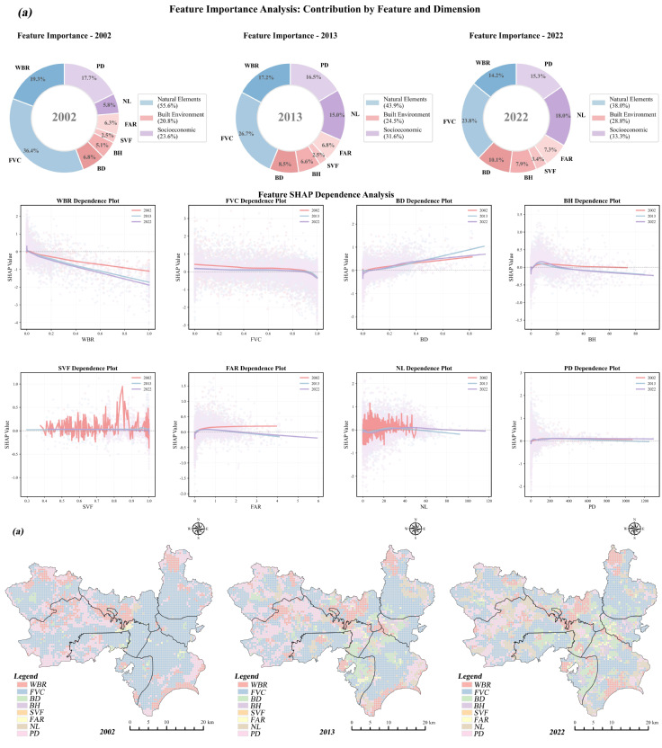 研究发现,合肥市的地表温度格局从2002年的“单核心集聚”逐步演变为2022年的“多核心分散”。高温区由老城区逐渐向新兴区域扩展,而生态节点的低温区则得以保持。LST的驱动机制由自然要素主导逐渐转变为自然、建成环境与社会经济因素的三维协同作用,特别是与人类活动相关的夜间灯光等指标的影响日益增加。此外,研究还揭示了关键因素的非线性阈值效应,以及LST驱动因素在不同区域和时期的时空异质性。研究为复杂地理过程的分析提供了新的方法框架,并为合肥市及其他快速城市化地区的热环境治理提供了有效的技术路径。