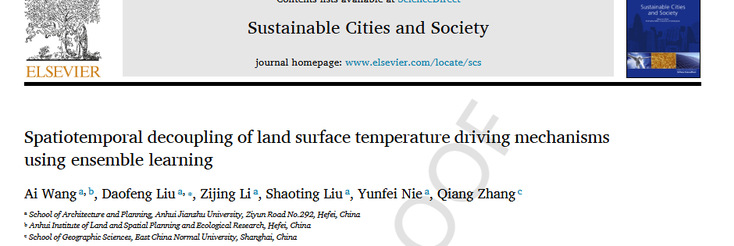 本网讯近日,beat365亚洲体育官方网站建筑与规划学院教师在城乡规划领域顶级期刊《Sustainable Cities and Society》(中科院一区Top期刊,2025年影响因子12.0)上发表了题为《Spatiotemporal Decoupling of Land Surface Temperature Driving Mechanisms Using Ensemble Learning》的研究论文。教师王爱为论文第一作者,2023级硕士研究生刘道烽为通讯作者,beat365亚洲体育官方网站为第一完成单位。