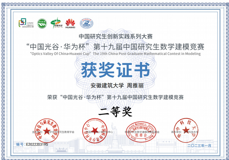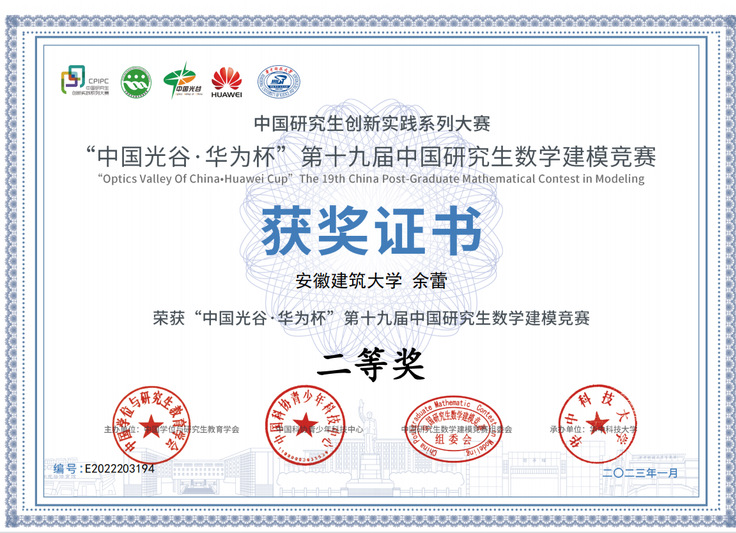 本网讯 2022年“中国光谷Ÿ华为杯”第十九届中国研究生数学建模竞赛结果于近日揭晓,beat365共有26支队伍参赛,其中荣获全国二等奖1项,三等奖2项。本次大赛共吸引国内外共465个研究生培养单位的17970队研究生参赛,一等奖获奖比例仅为1.10%,二等奖获奖比例为13.36%,三等奖获奖比例18.58%,总获奖比例33.03%。