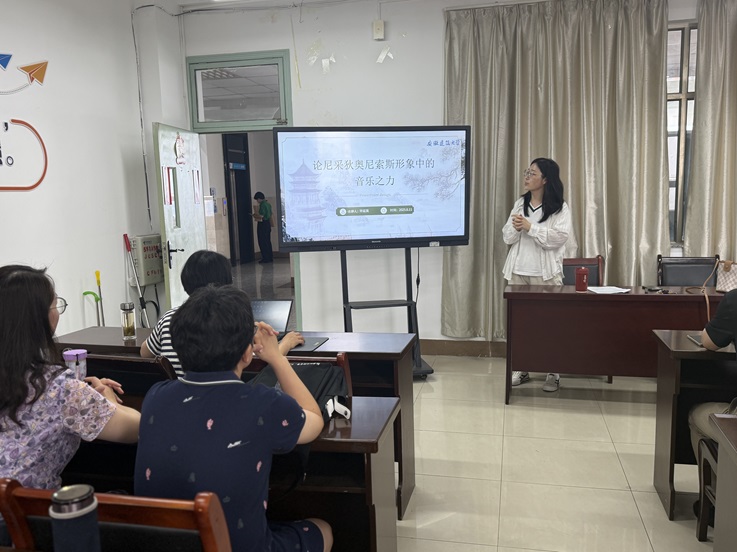 本网讯 6月11日,外国语学院成功举办“新文科建设系列论坛”专题学术活动,围绕“尼采狄奥尼索斯形象中的音乐之力”展开深入研讨。本次讲座由英语系毕延英老师担任主讲,外国语学院师生代表20余人参与,通过PPT演示与现场研讨相结合的方式,揭开尼采哲学中音乐元素的神秘面纱。