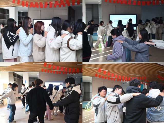 “小组赛”环节将活动推向高潮。“穿越呼啦圈”考验团队策略与协作默契,同学们手牵手不松开,灵活传递呼啦圈,每一次成功都伴随热烈欢呼;“兔子舞”以欢快节奏要求步伐统一、全神贯注,尽显青春活力;经典项目“心有千千结”则深度检验团队智慧与信任,当复杂绳结在共同努力下解开时,成员们深刻领悟到沟通、信任与集体智慧在学生工作中的核心价值。尾声的“回归集体”环节中,全体成员肩并肩、手搭肩,在静默与轻声哼唱中感受彼此支撑与团队力量。