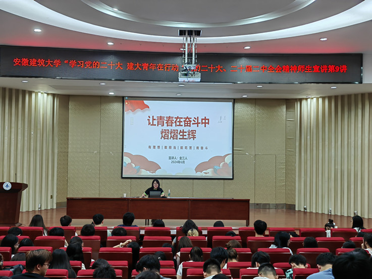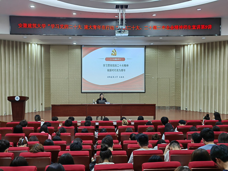 本网讯 6月13日,“学习党的二十大,建大青年在行动”党的二十大、二十届二中全会精神师生宣讲团“(第9讲)走进公共管理学院。公共管理学院、经济与管理学院领导,辅导员、学生代表、班级思政委员等200余人参加宣讲会。
