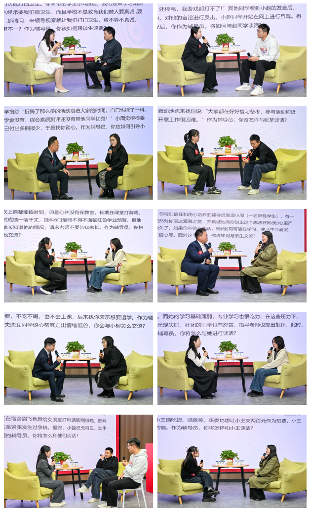 经过初赛、复赛的激烈角逐,共有10位辅导员脱颖而出进入本次决赛。决赛采用谈心谈话的方式,系统考察辅导员的政治素养、理论水平、沟通技巧、问题处置及育人实践等综合能力。