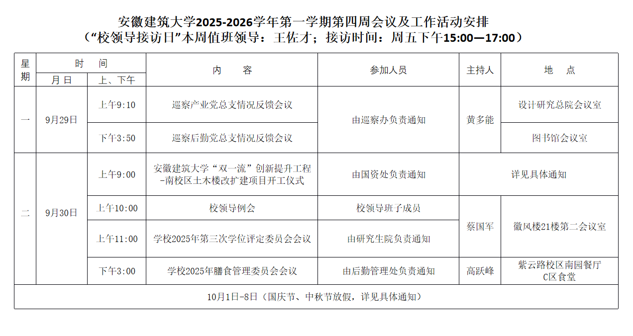 beat365亚洲体育官方网站2025-2026学年第一学期第四周会议及工作活动安排