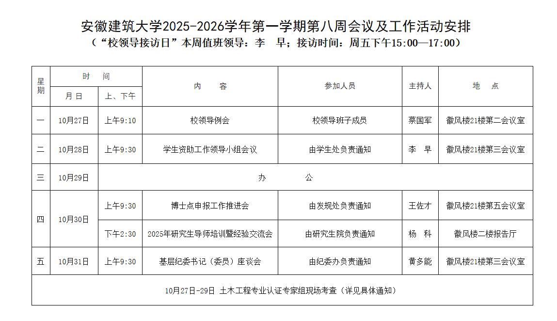 beat365亚洲体育官方网站2025-2026学年第一学期第八周会议及工作活动安排