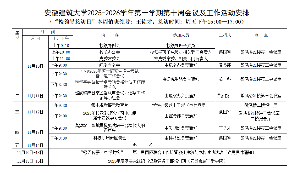 beat365亚洲体育官方网站2025-2026学年第一学期第十周会议及工作活动安排
