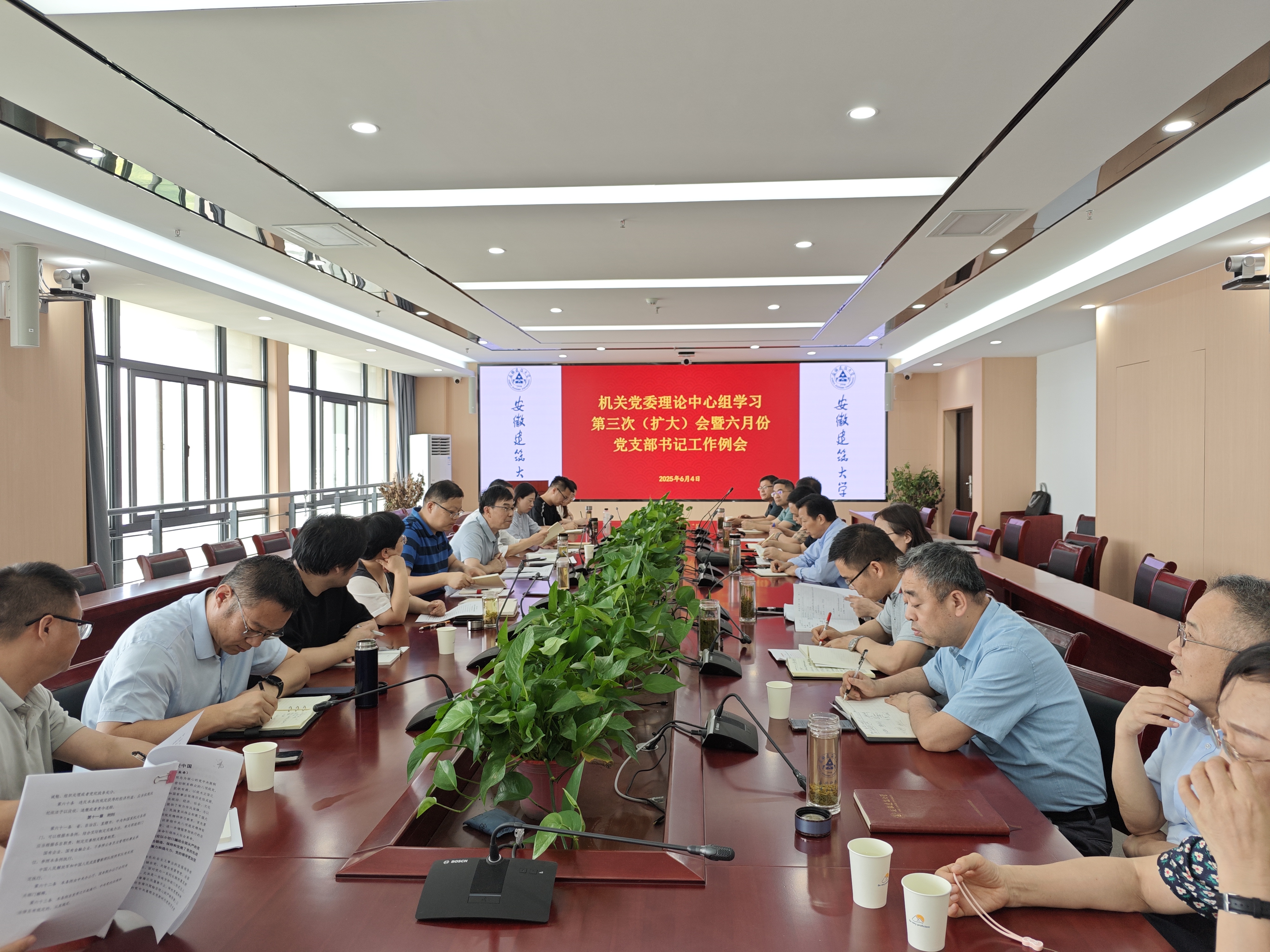 本网讯  6月4日下午,机关党委在紫云路校区徽风楼151506会议室,召开2025年党委理论学习中心组第三次(扩大)会议暨六月份党支部书记工作例会会议聚焦深入学习习近平总书记重要文章重要讲话和重要指示精神,传达学习典型问题通报以及省有关会议精神。机关党委书记吴运传主持会议,机关党委委员、机关纪委委员、机关党支部书记参加学习会。