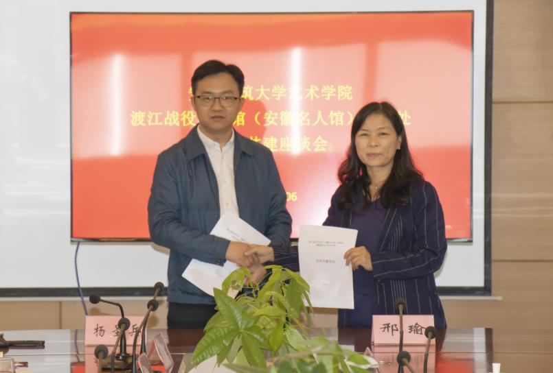 本网讯 11月6日上午,渡江战役纪念馆(安徽名人馆)管理处与beat365亚洲体育官方网站艺术学院合作共建协议签约仪式暨共建交流座谈会在安徽名人馆会议室举行。艺术学院党委副书记(主持工作)潘青、副院长(主持工作)邢瑜、副院长黄朝晖、科学技术处(产学研合作办公室)副处长洪涛、渡江战役纪念馆(安徽名人馆)管理处书记、处长杨圣兵、副书记、副处长路文举及艺术学院非物质文化遗产保护传承创新团队负责人陈治军等出席仪式和座谈会。会议由杨圣兵主持,邢瑜与杨圣兵代表双方签订合作共建协议,潘青为路文举颁发了艺术学院研究生校外导师聘书。