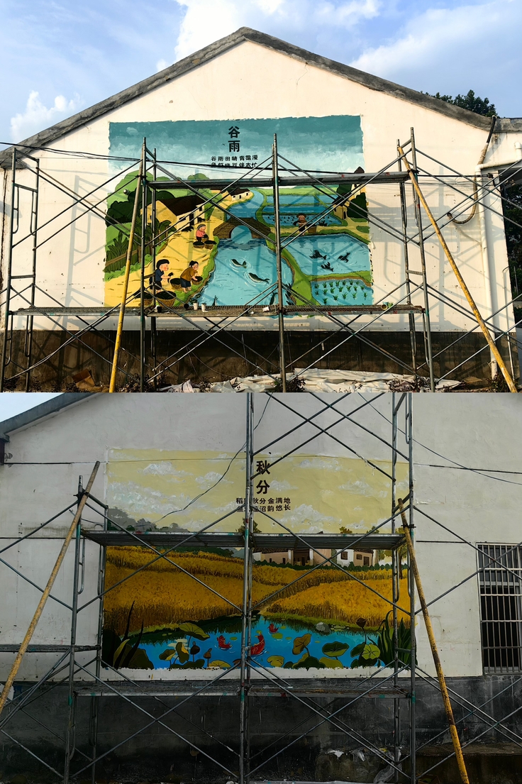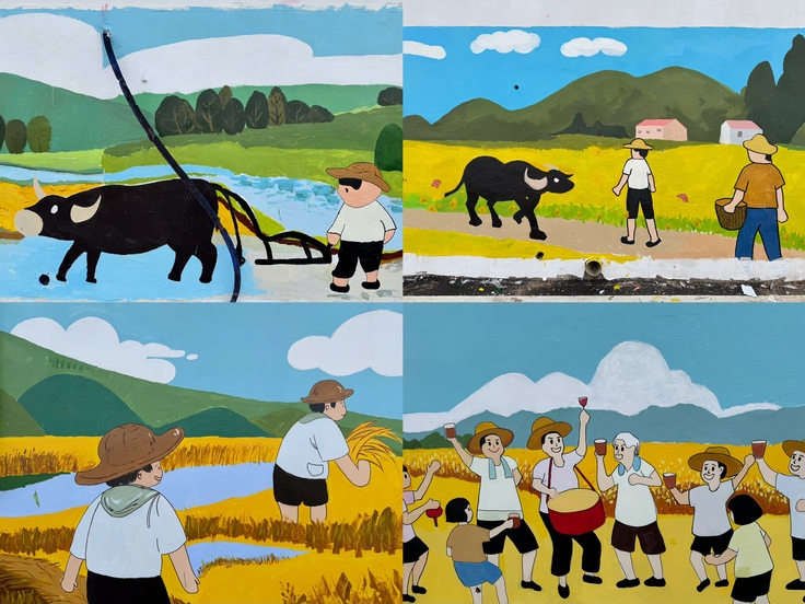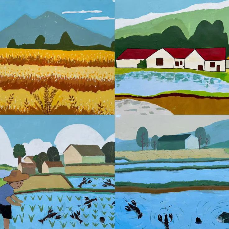 针对当地“稻虾共作”特色产业,杨芳老师带领学生们创作了《二十四节气图》,其中《夏至》《秋分》两幅墙绘极具代表性,画面中,农户们在田间劳作,水田插秧、稻穗金黄、虾肥鱼跃,细腻生动呈现在墙面上。村民们驻足观赏,感慨不已,“这些画把农忙生活变成了咱能看懂的画面,党的好政策就像这稻穗一样,在我们这里结满了幸福的果实”。