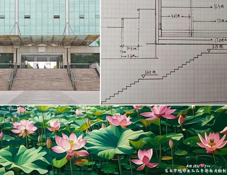 本网讯 为建设文明美丽校园,推动美育教育与校园文化建设的有机融合,营造浸润式美育环境,学校党委学工部联合艺术学院精心组织“匠心巧绘荷塘韵 阶梯焕彩艺术廊”主题实践活动。艺术学院师生充分发挥专业优势,将徽学楼的阶梯立面打造成一幅流淌着江南诗韵的荷塘画卷,成为校园中一道引人入胜的艺术景观长廊。
