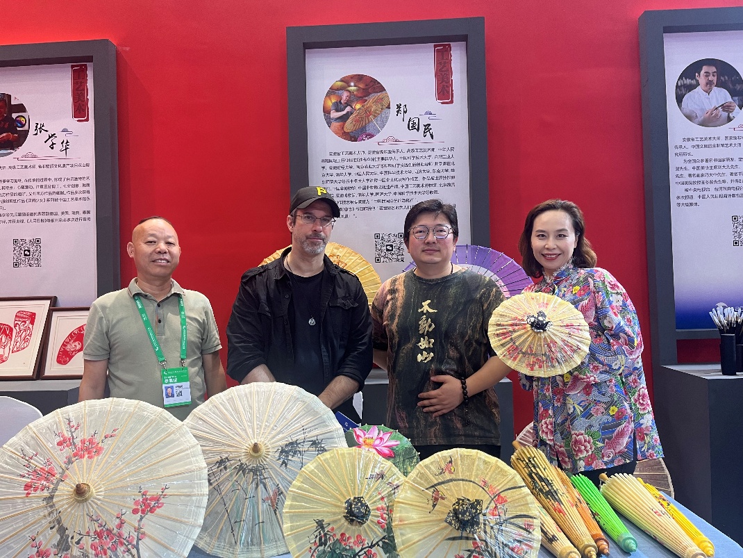 在工艺美术及非遗技艺展区,艺术学院刘琳琳、谷宗州老师正与安徽省省级非物质文化遗产“泾县油布伞制作技艺”代表性传承人郑国民洽谈校企合作事宜。外籍教师Marc Wiechmann参与交流,围绕传统工艺与现代技术的融合路径展开探讨,为非遗创新设计提供国际化视角。